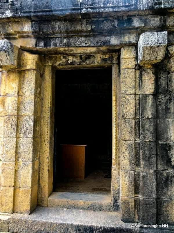 එහි ඇතුලුවන දොරටුවට මදක් ඈතින් සරල කොරවක් ගලක් සමගින් පඩි පේලියකි. ගොඩනැගිල්ලේ අභ්‍යන්තරයට ප්‍රවිෂ්ඨ වීමට ඇත්තේ ශෛලමය උලුවස්සකි. වෙනත් කිසිදු ජනේලයක් හෝ නොතිබීම යම් විශේෂත්වයක්. උලුවස්සේ දෙපැත්තේ නයි පෙන 19 බැගින් ද, එලිපත්තේ නයිපෙන 12 ක්ද කැටයම් කොට ඇත. ඊට ඉහලින් නෙළුම් මල් ද්විත්වයකි. අතීතයේ මෙහි ශෛලමය දොරක් පැවති බව විහාරාධිපති හිමියන් කියූවත් මි පරාසයක් අද වන විට එහි නෂ්ටාවශේෂ හෝ දැක ගන්නට නැත.